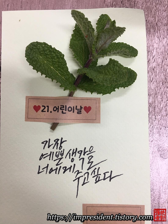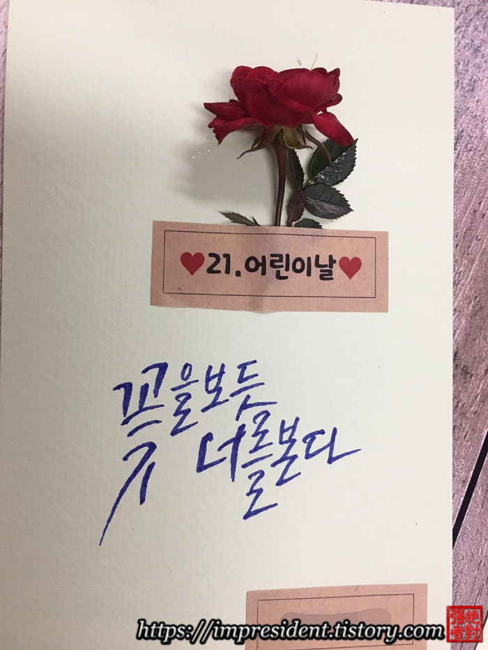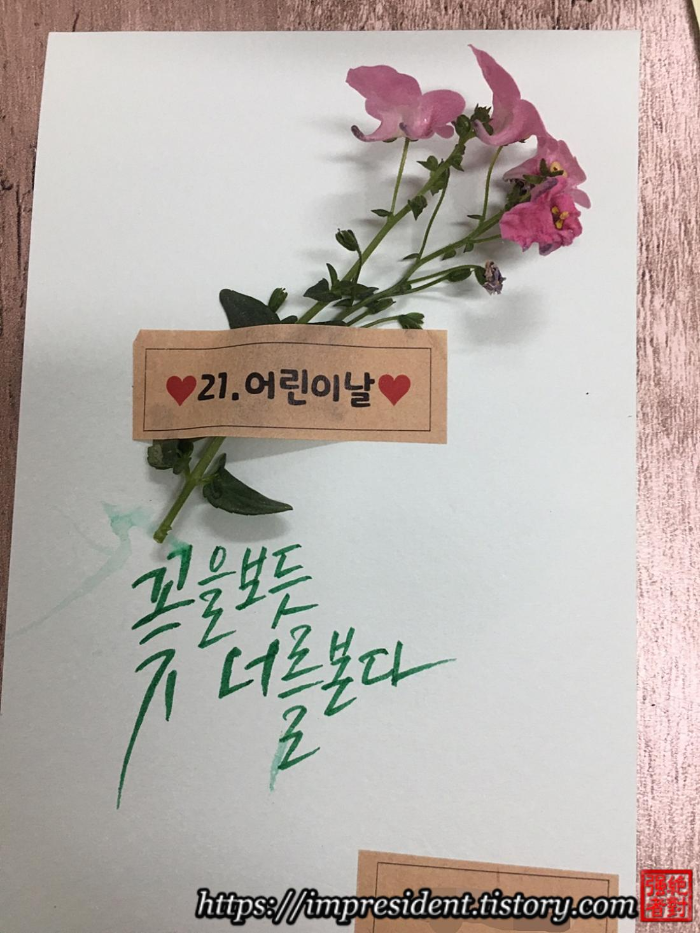 ์ฌํด์ ์ด๋ฆฐ์ด๋ ์นด๋ ๋ฌธ๊ตฌ๋....'๊ฐ์ฅ ์์ ์๊ฐ์ ๋์๊ฒ ์ฃผ๊ณ ์ถ๋ค', ์ '๊ฝ์ ๋ณด๋ฏ ๋๋ฅผ ๋ณธ๋ค'์์ต๋๋ค.