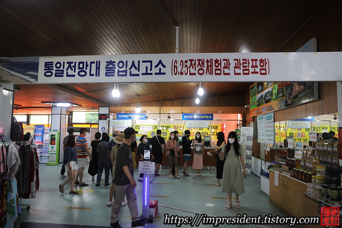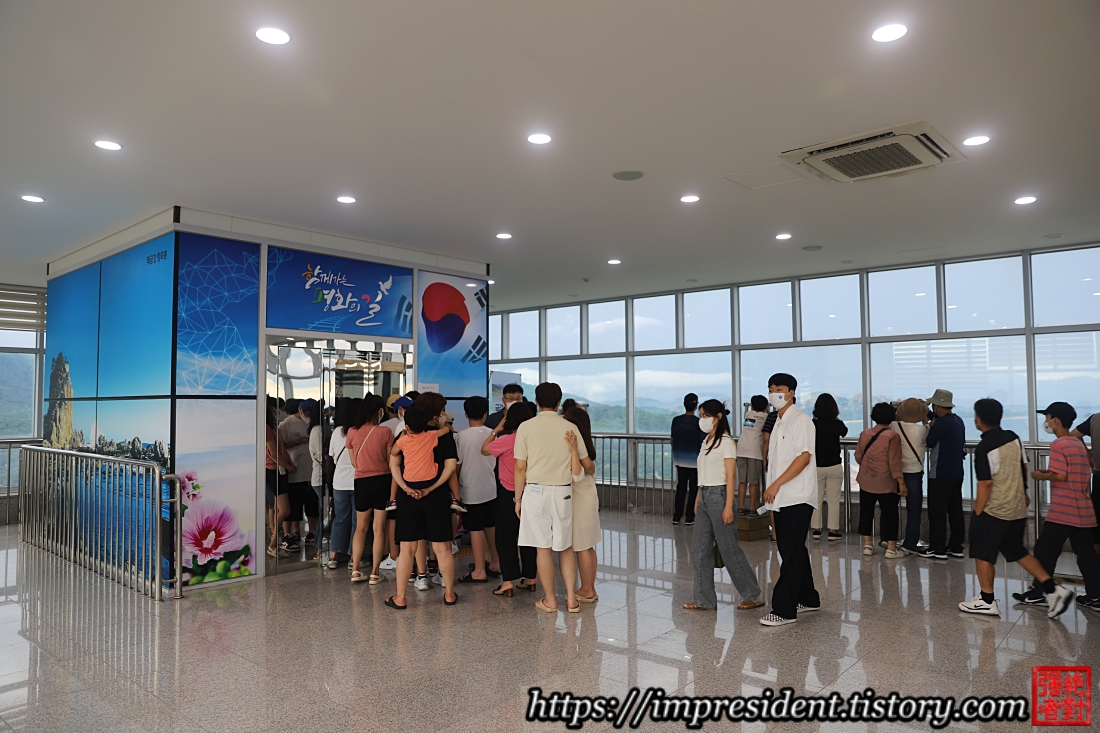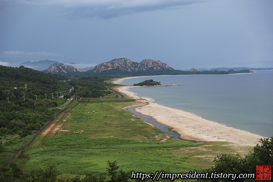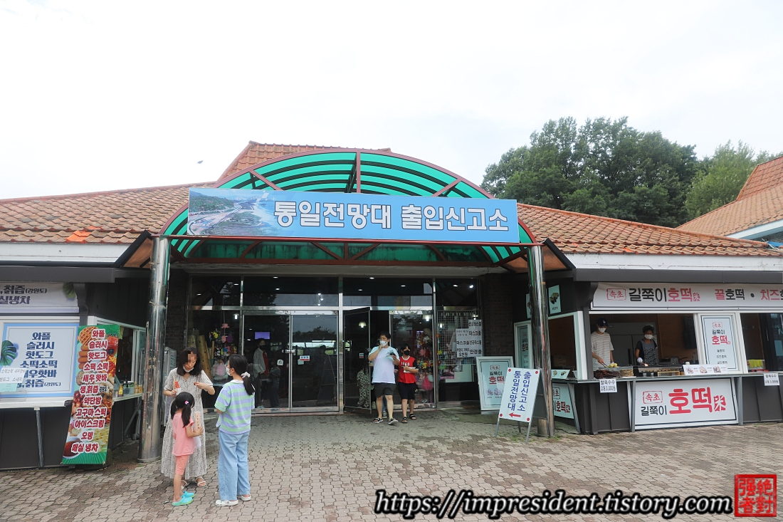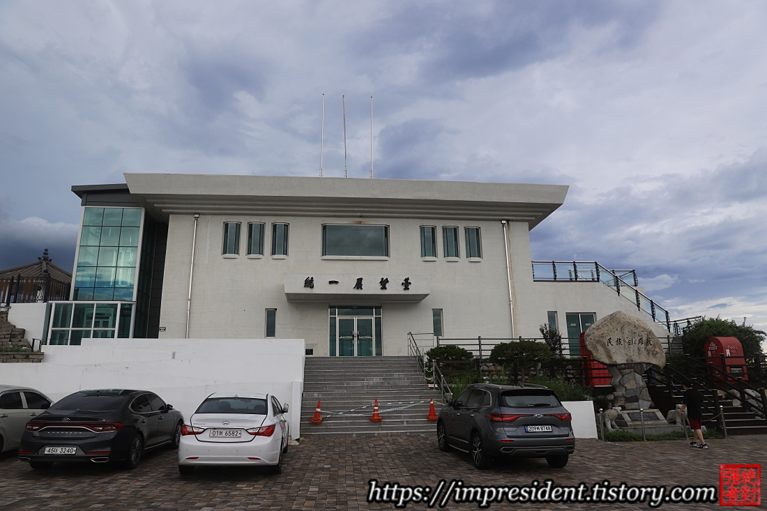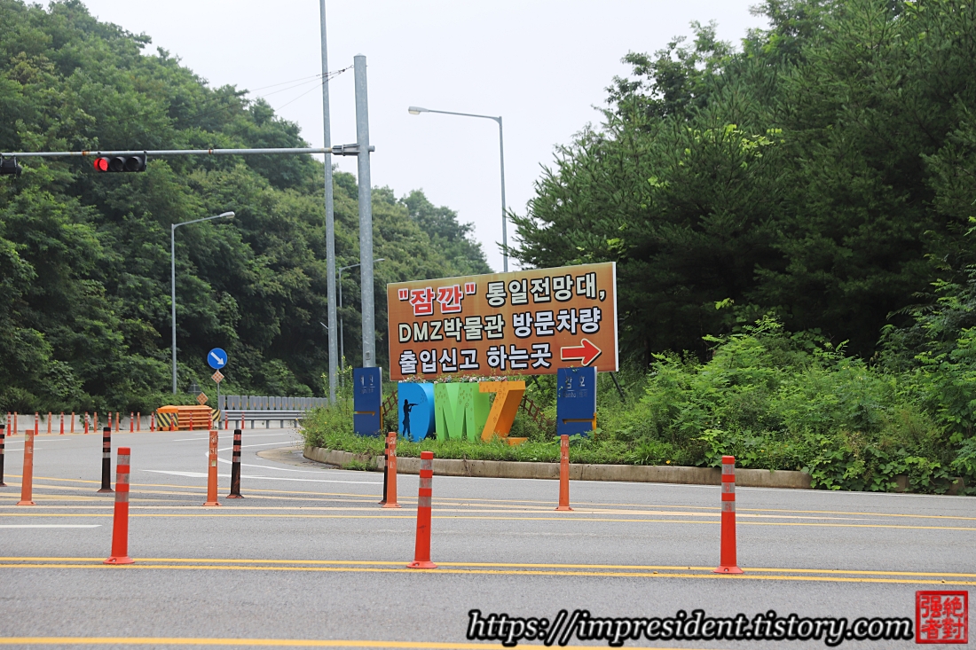 ๊ทธ๋ฆฌ๊ณ ์ฃผ์ฐจ์ฅ์ ์ ๋ฉด์ผ๋ก ๋ณด์ด๋ DMZ์ 'D'๋ฅผ ํ์ํํ ๊ณ ์ฑ ํต์ผ์ ๋งํ์์ ๋ชจ์ต์ด ๋ณด์ ๋๋ค.